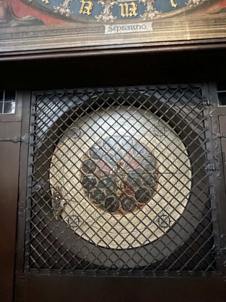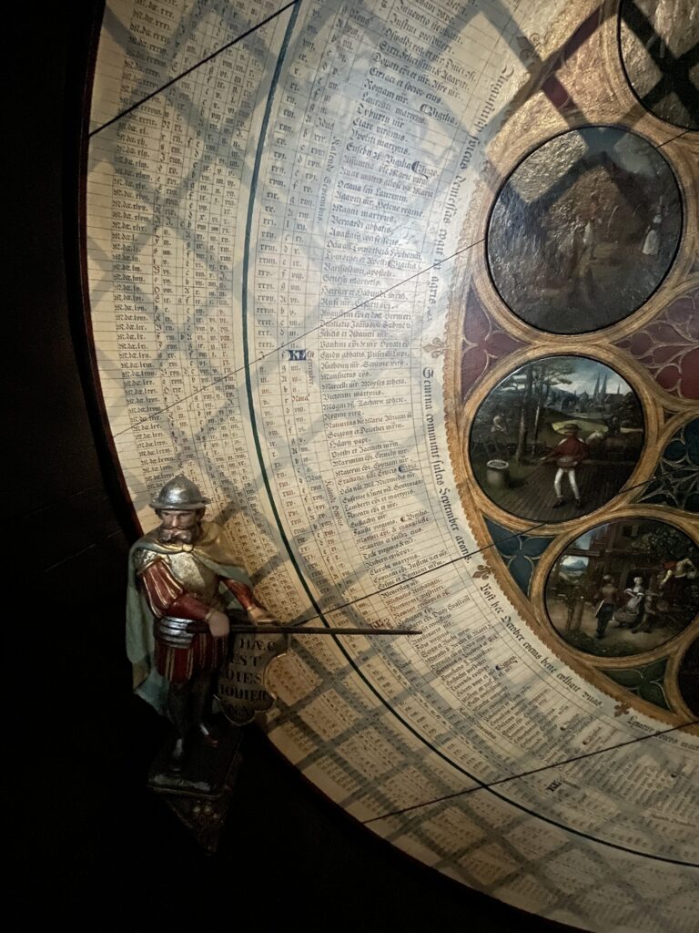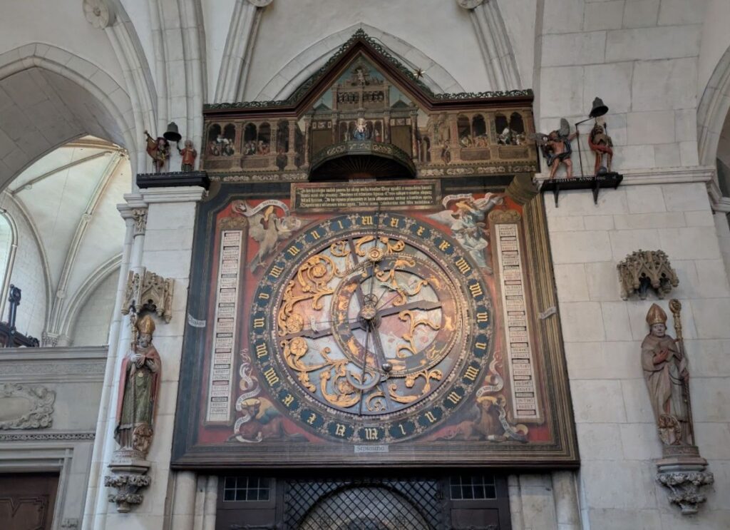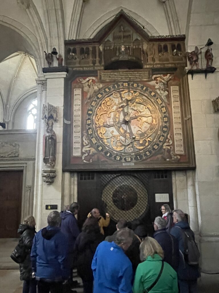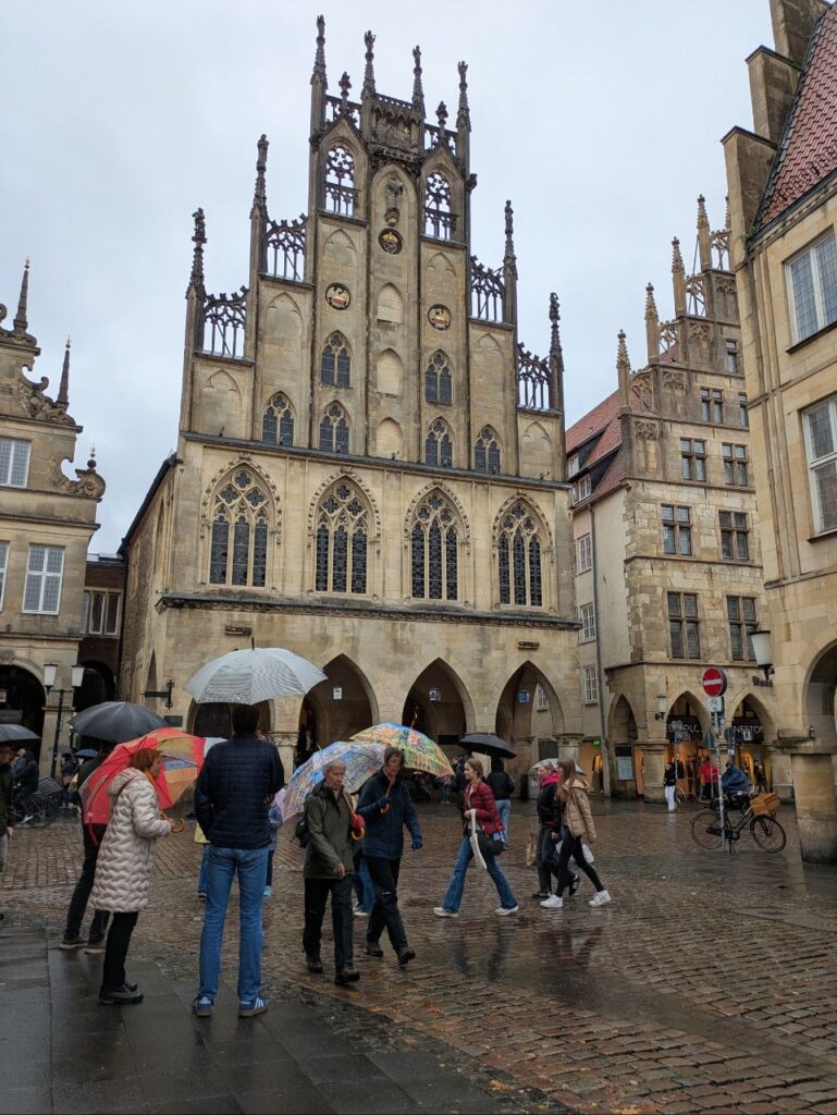 Vervolgens doorgereden naar Münster. Binnen 10 minuten waren mijn voeten kletsnat in mijn gympen, en aangezien ik toch winterschoenen nodig heb een buitensport winkel in gegaan en een paar mooie Meindls gekocht. De verkoper had er echt zin en rende de hele winkel op en neer om ook nog goede droge sokken te vinden. De paraplu weer opgestoken en op naar het Rathaus waar de vrede van Munster is getekend en waar Nederland voor de eerste keer als soevereine staat werd erkent. We konden niet gelijk naar binnen maar hebben wel kaartjes gekocht voor later. Om de tijd te doden zijn we naar de St Paulus Dome gelopen waar een prachtige astronomische klok hangt. Verder is het een kale kerk, die toch wel mooi is door zijn eenvoud. Ook hing er een prachtig blauw/groen kunstwerk (Vroomheid en Opstanding) die gemaakt werd door kunstenaar Thomas Lange.