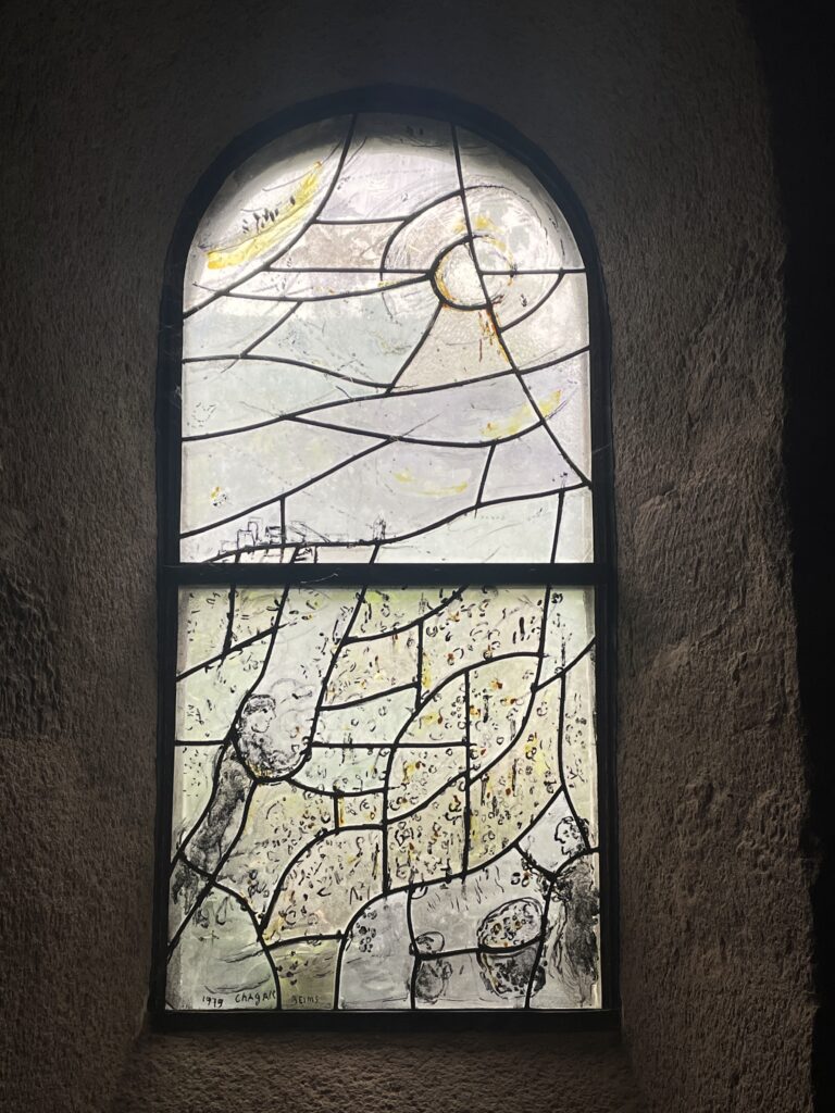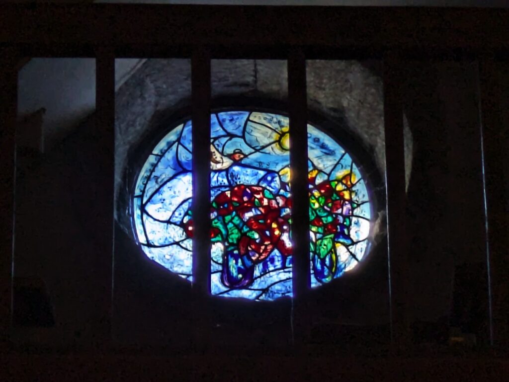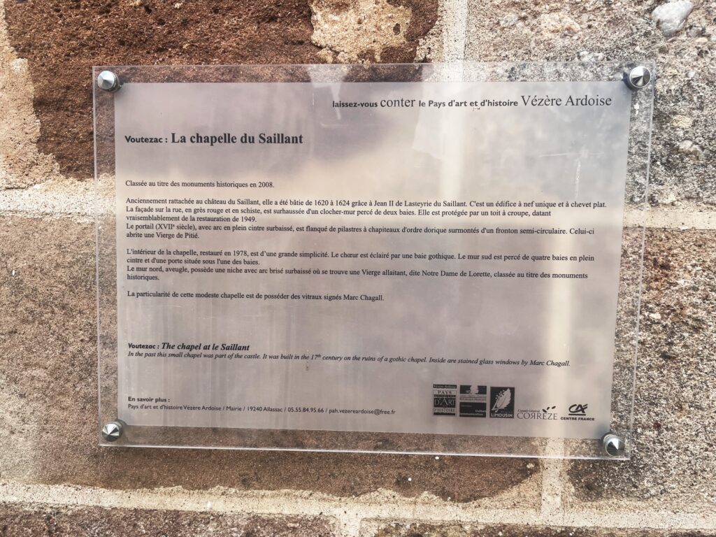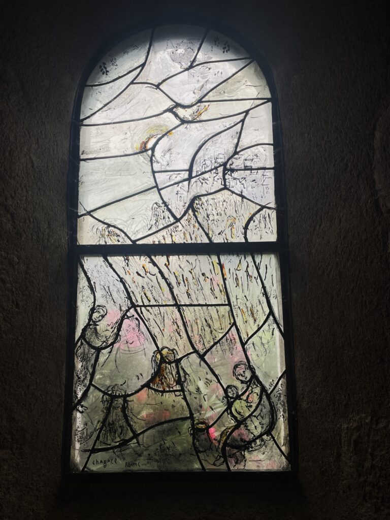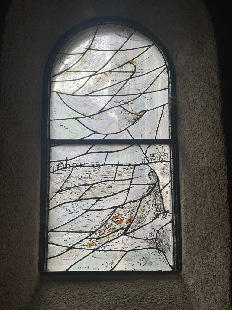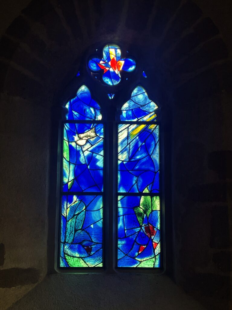Vanochtend om 09.00 uur vertrokken uit Bordeaux, richting een lief klein Kerkje in Saillant met de verrassende naam Chapelle du Saillant een plaatsje zo’n 20 km van Limoges. In het kerkje bevatten alle ramen glas in lood gemaakt door Marc Chagall. Dit keer niet alleen de bekende kleuren maar ook tekeningen. Echt erg mooi.