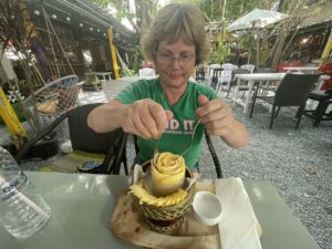 Daar zijn we overheen gelopen. Heel veel kleding met uiteraard eettentjes tussendoor. In een winkel voor Curry’s en gedroogd fruit wat curry zakjes voor thuis ingeslagen en gedroogde mango om hier op te eten. Nog een keer naar ons favoriete restaurant om de hoek van het hotel waar ik helaas een veel te pittige papaja salade bestelde. Afgeblust met vanille yoghurt en een toetje mango met sticky rice. Heerlijk.