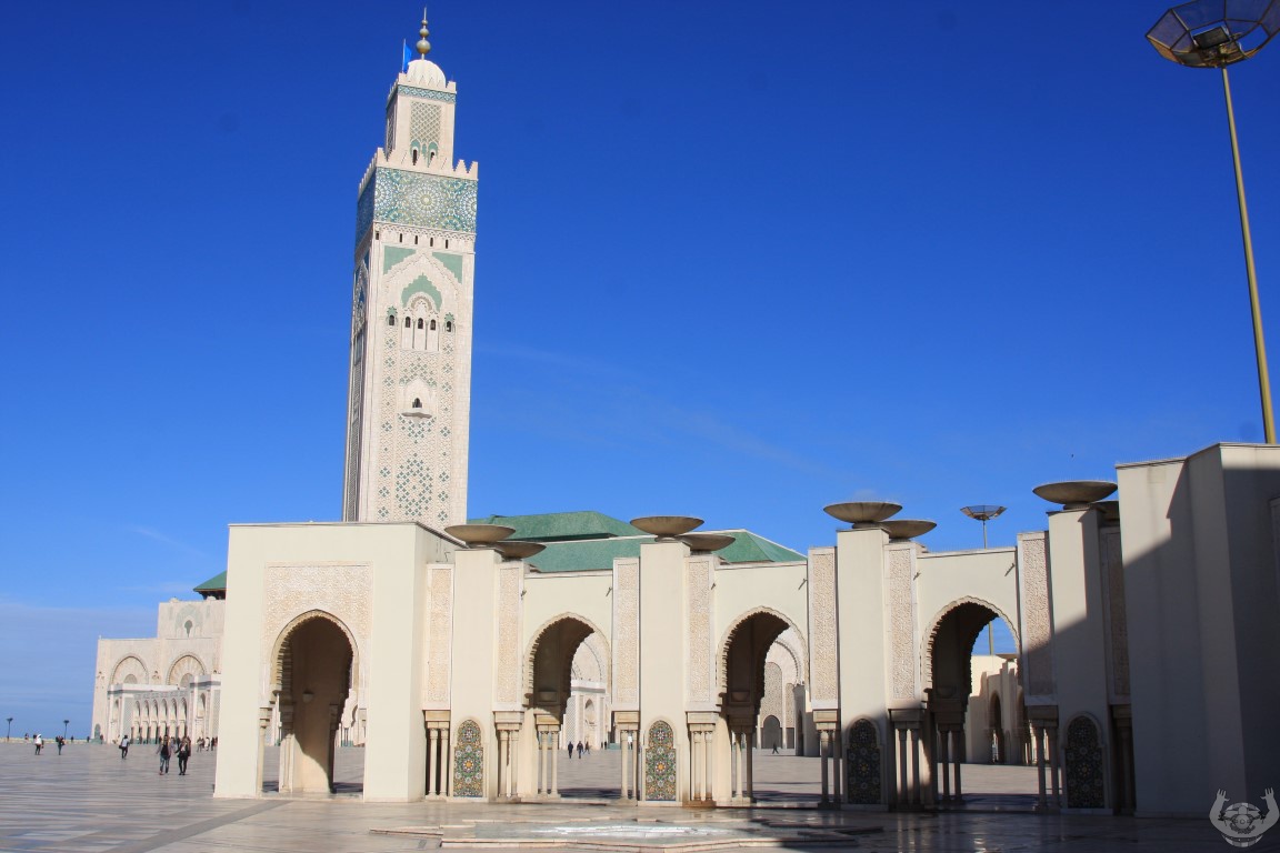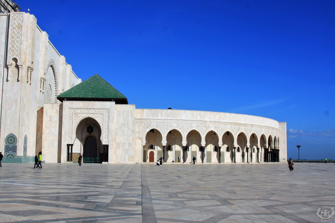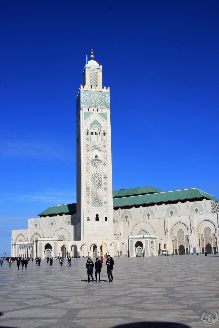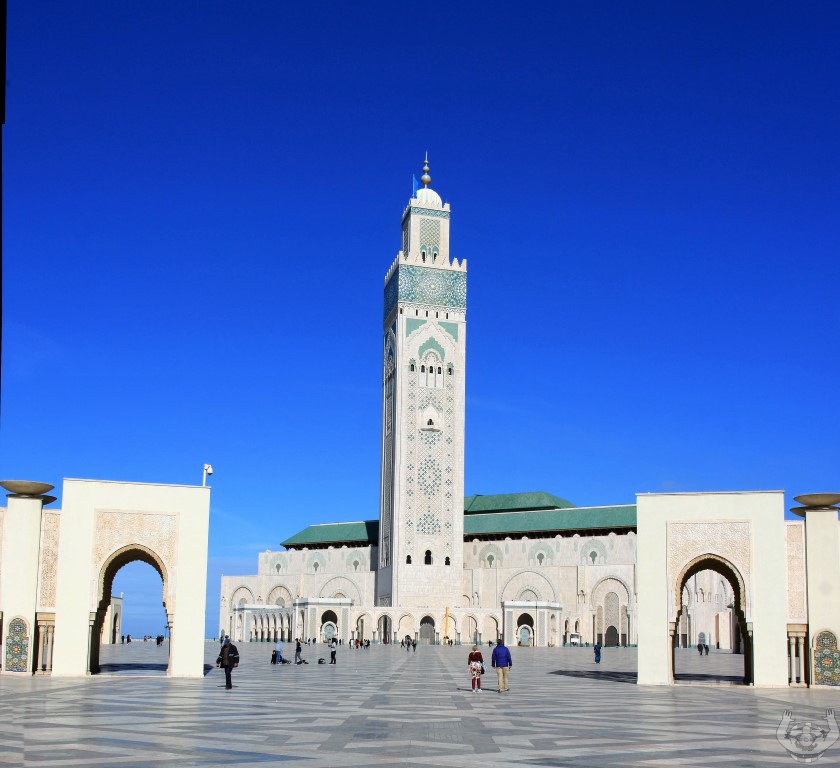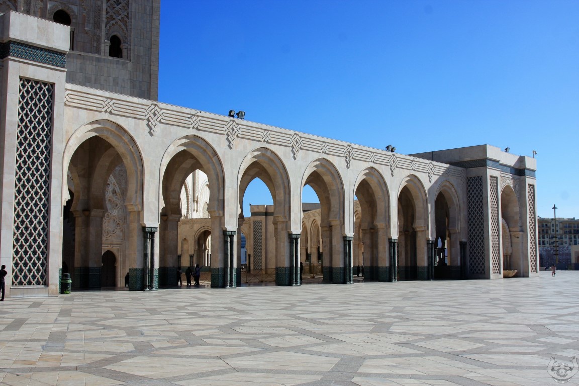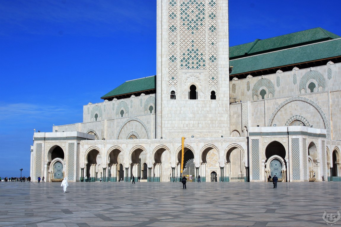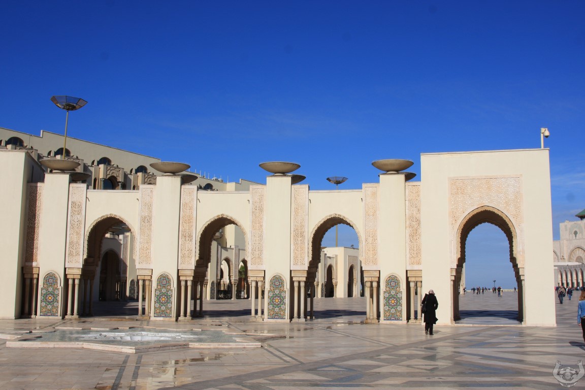 Place Mohammed V als eerste aangedaan. Er wordt een groot nieuw theater gebouwd. Daartegenover het paleis van justitie, gemeentehuis en een groot postkantoor. Op het plein een enorme fontein. Daarna bezoek aan de enorme Hassan II- moskee die deels gebouwd is op het water van de zee.