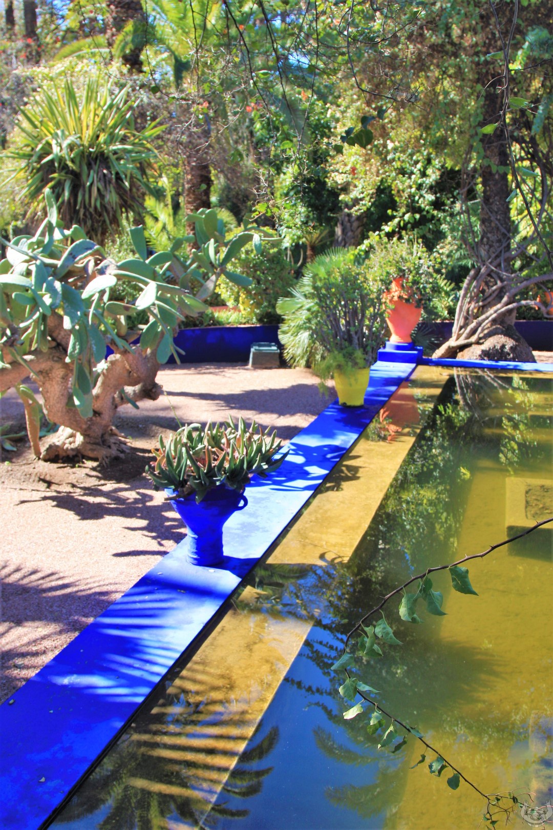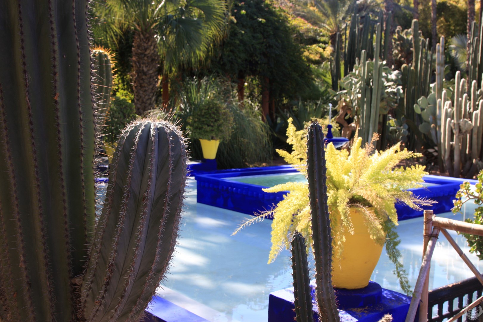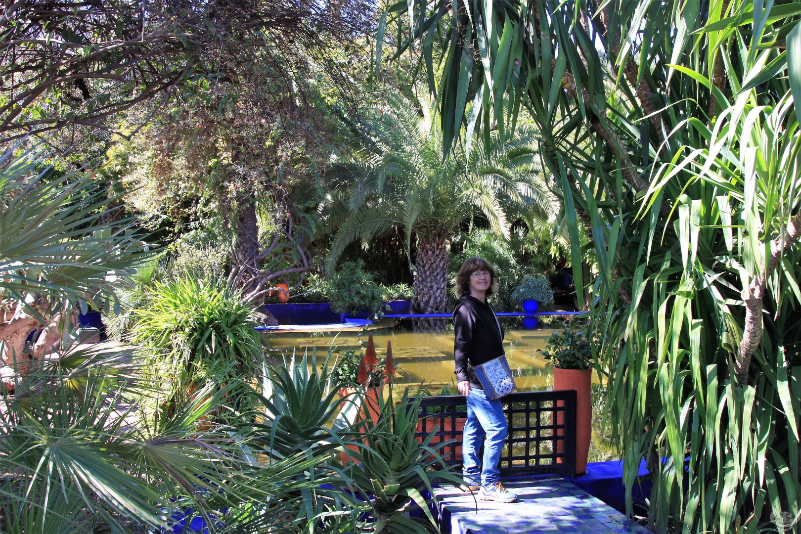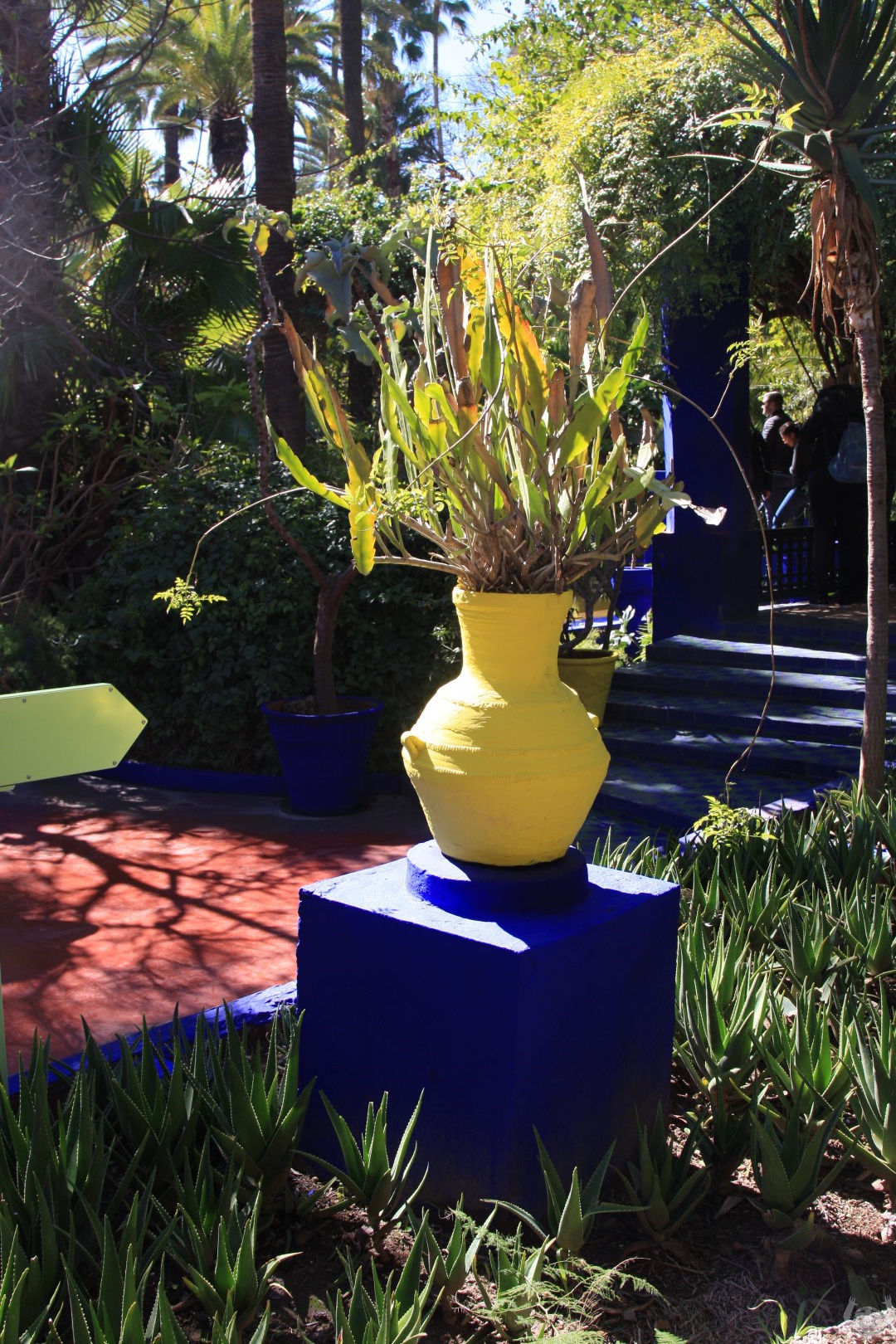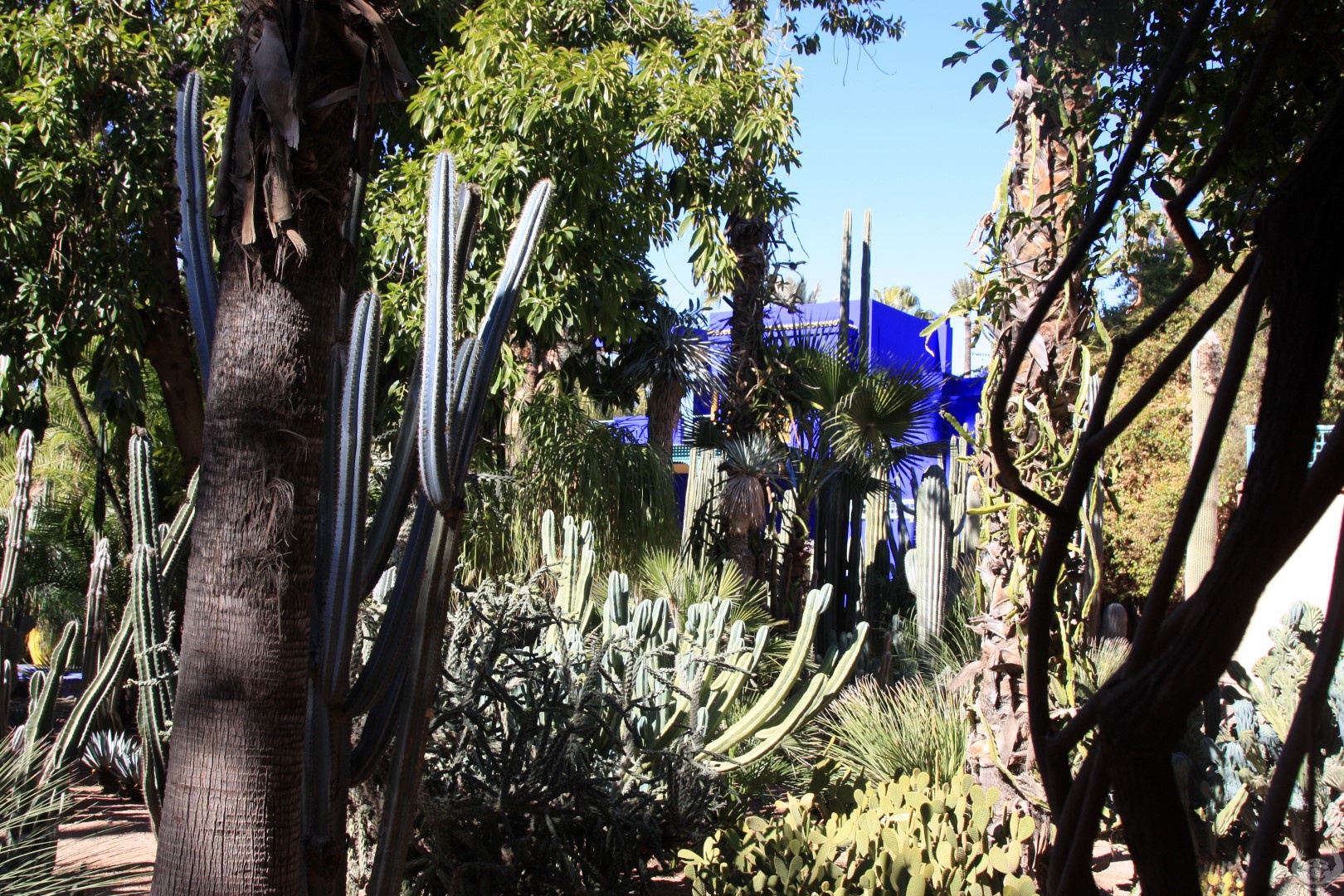 Na het ontbijt op pad naar de botanische tuin van Yves Saint Laurant. Een uur in de rij voor de kassa. Jardin Majorelle. Prachtige tuin met veel Majorelle blauwe accenten.