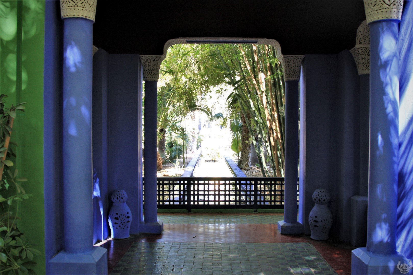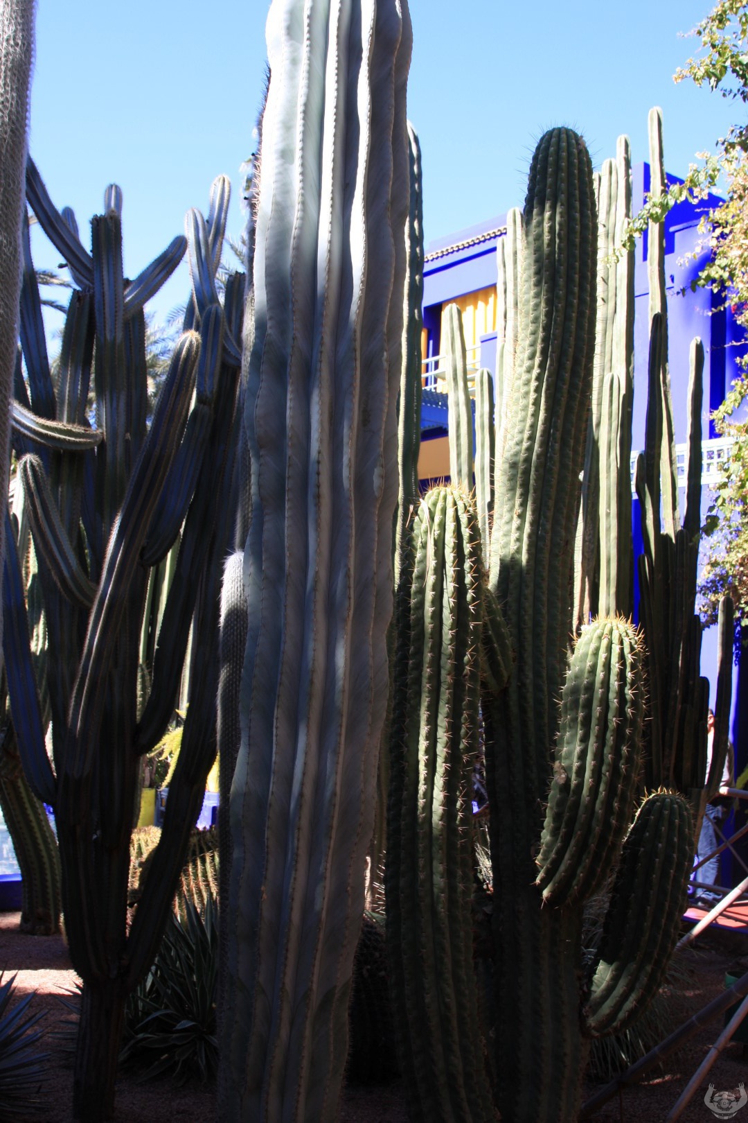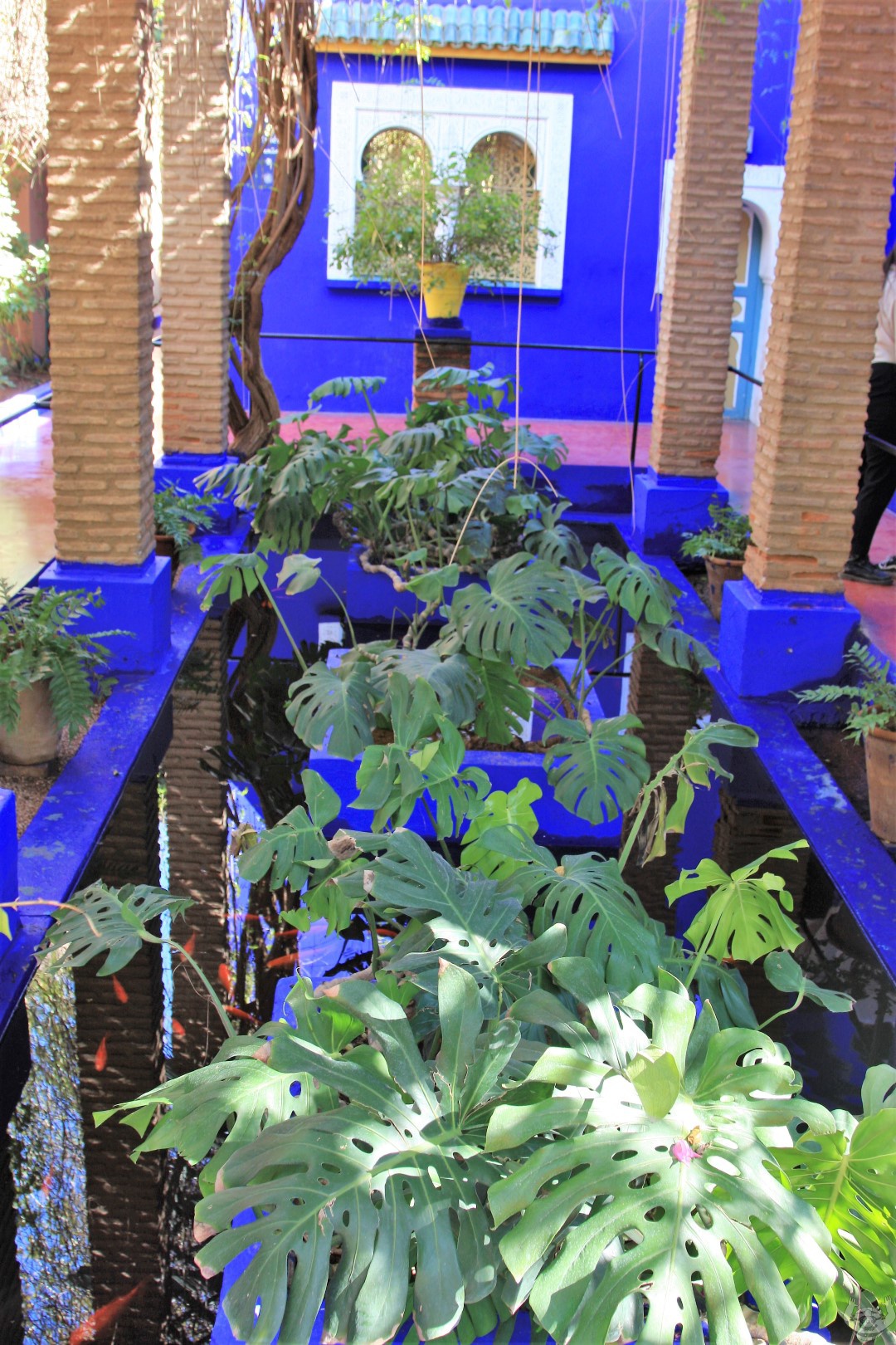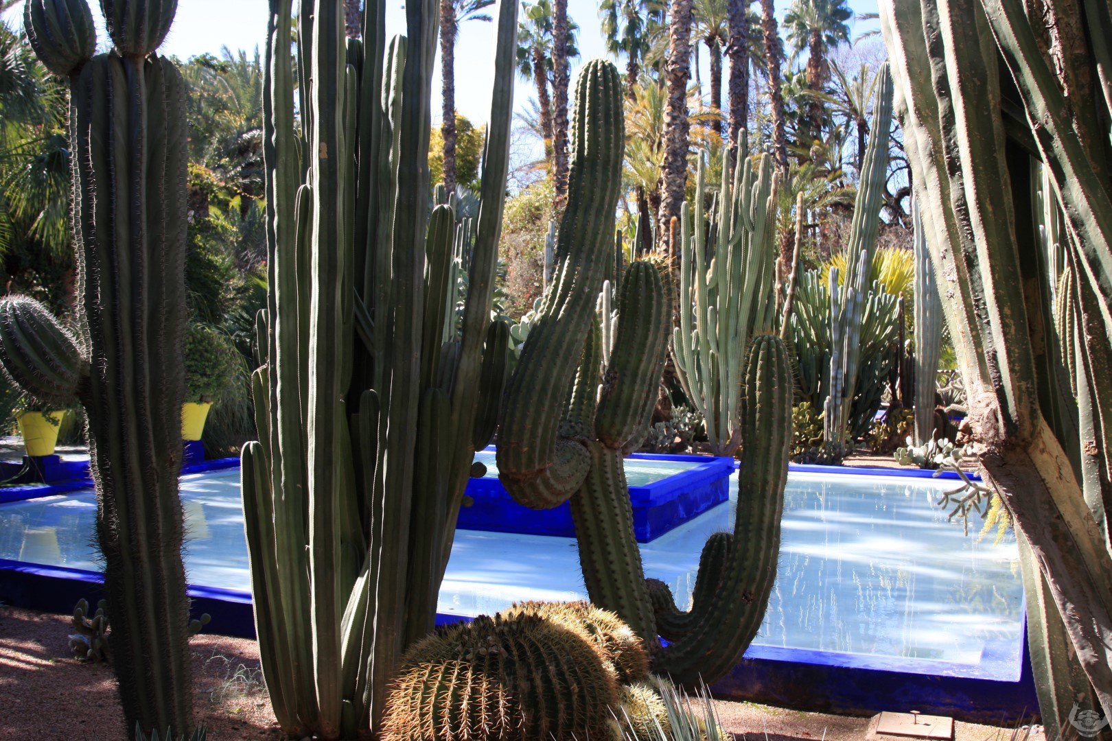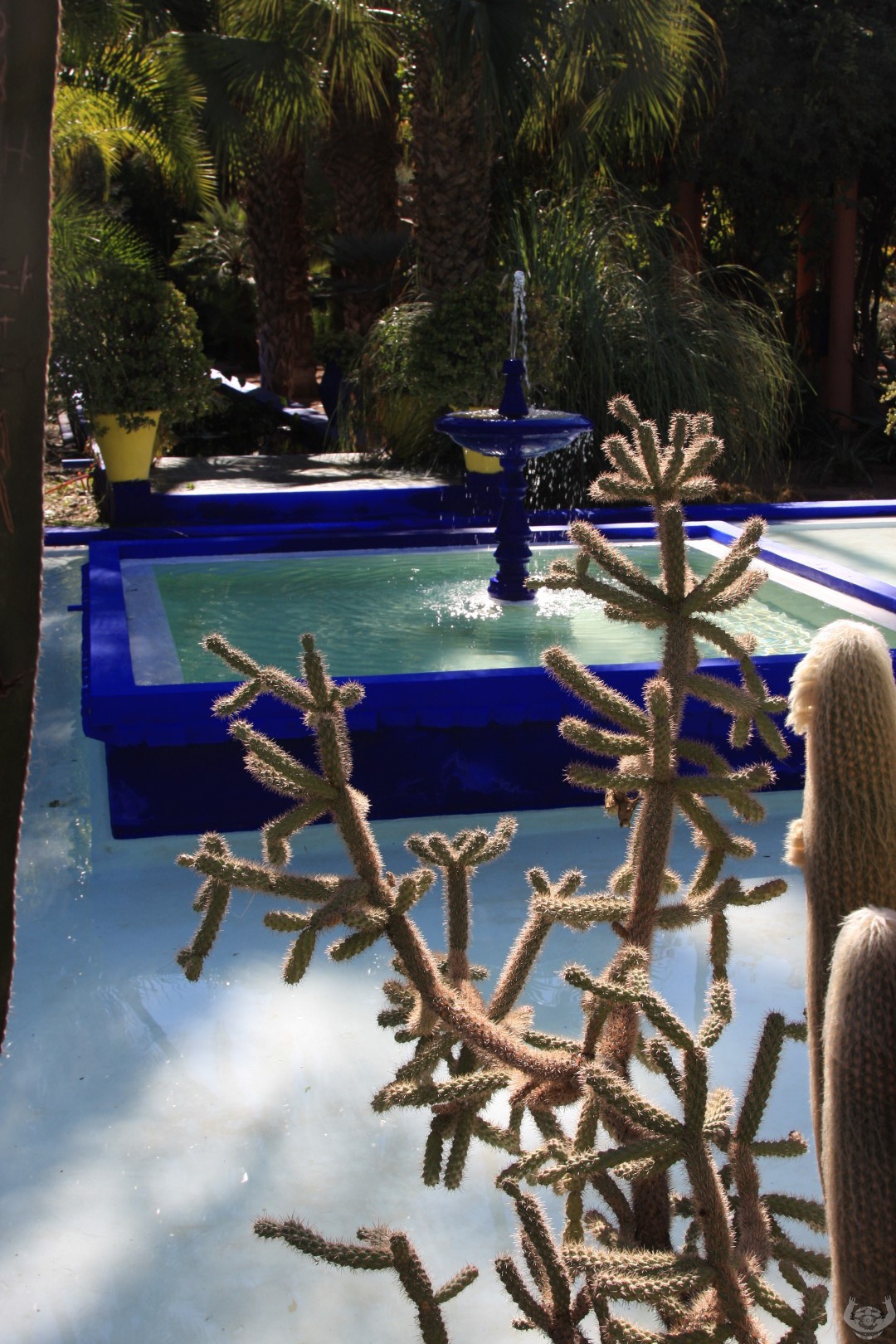 Na het ontbijt op pad naar de botanische tuin van Yves Saint Laurant. Een uur in de rij voor de kassa. Jardin Majorelle. Prachtige tuin met veel Majorelle blauwe accenten.