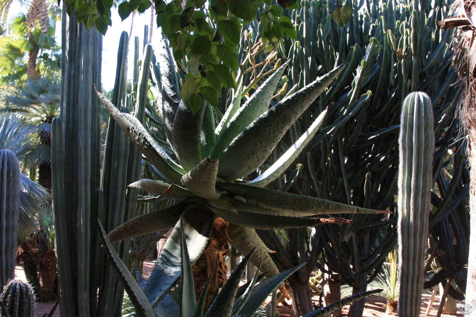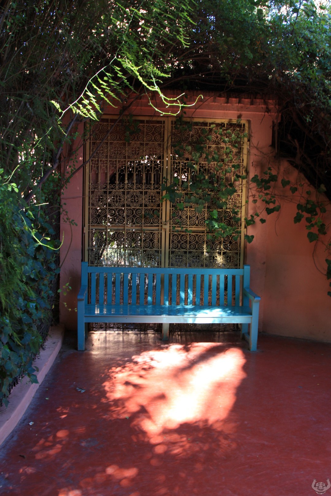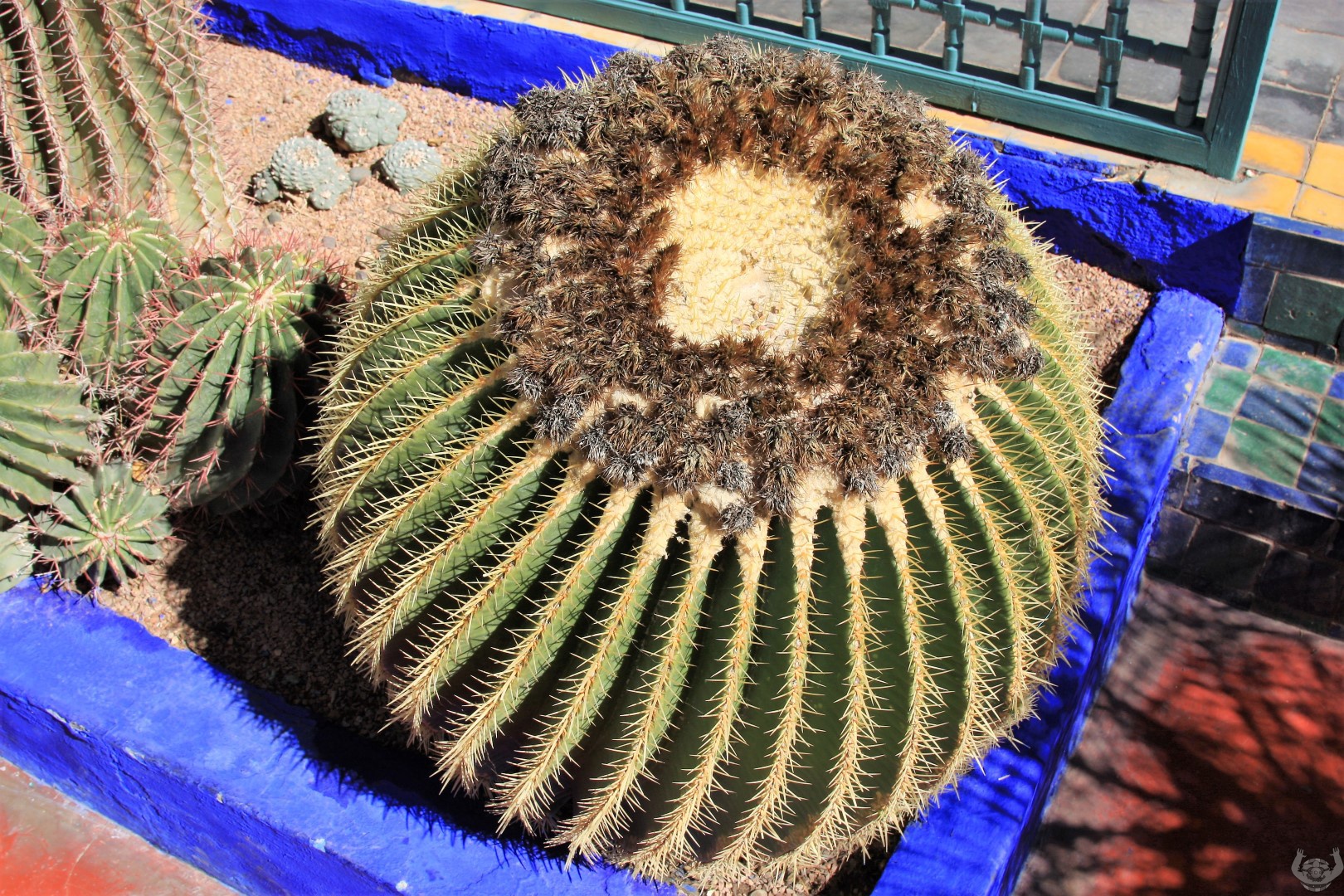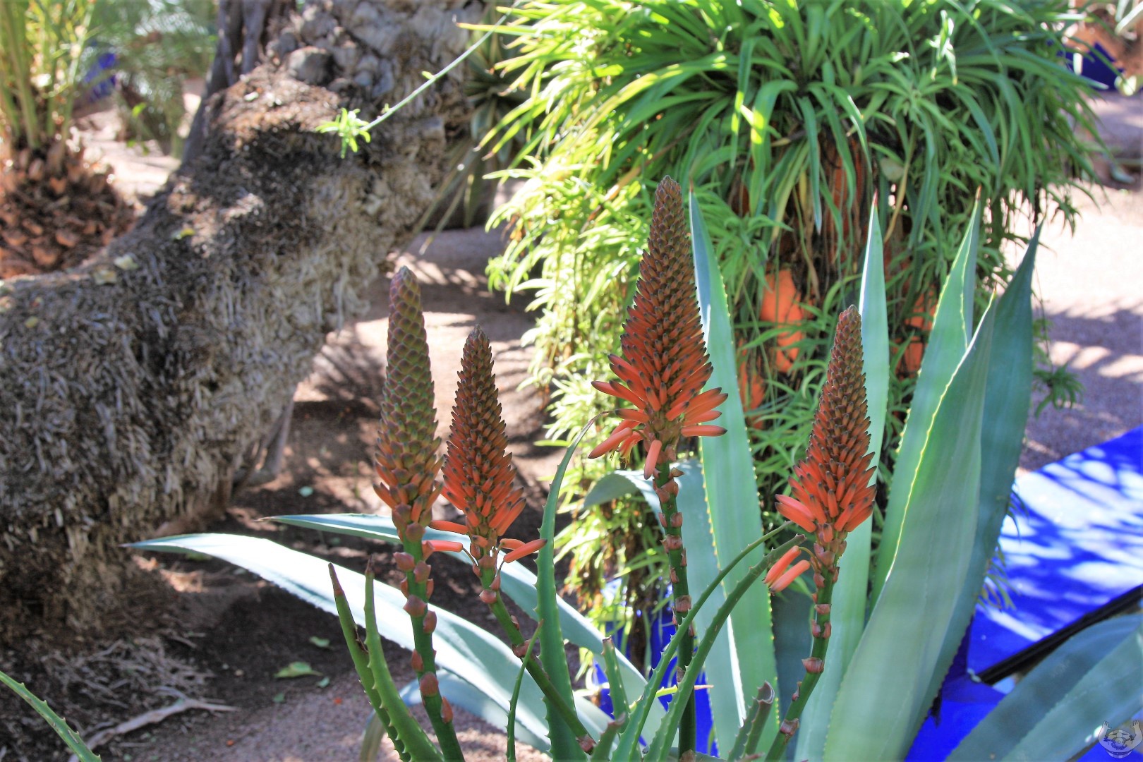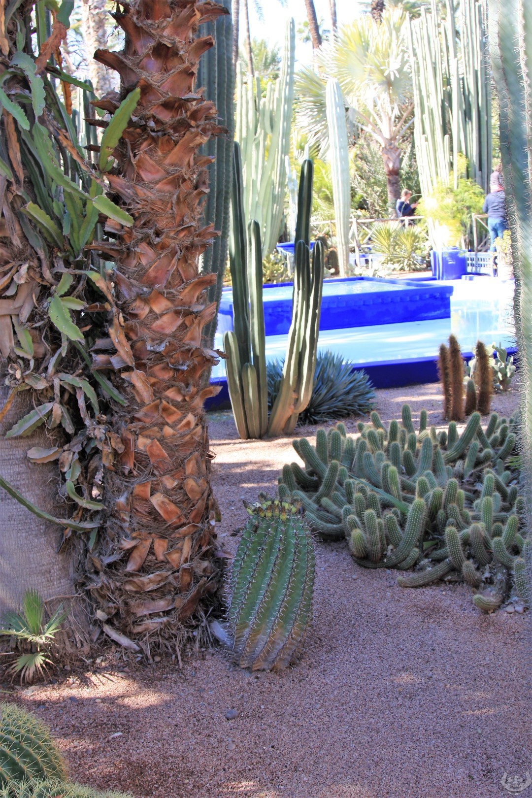 Na het ontbijt op pad naar de botanische tuin van Yves Saint Laurant. Een uur in de rij voor de kassa. Jardin Majorelle. Prachtige tuin met veel Majorelle blauwe accenten.
