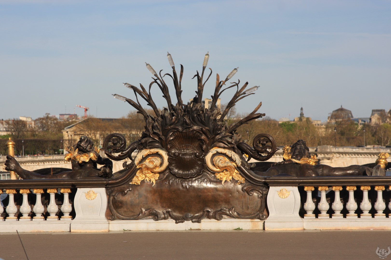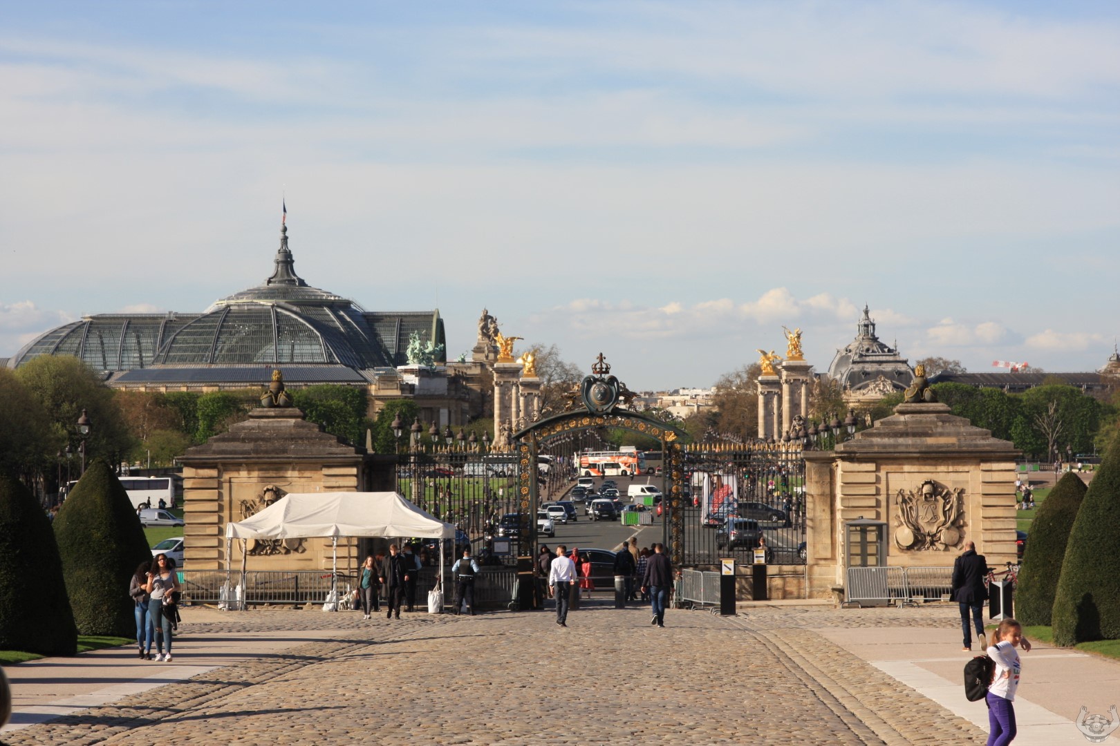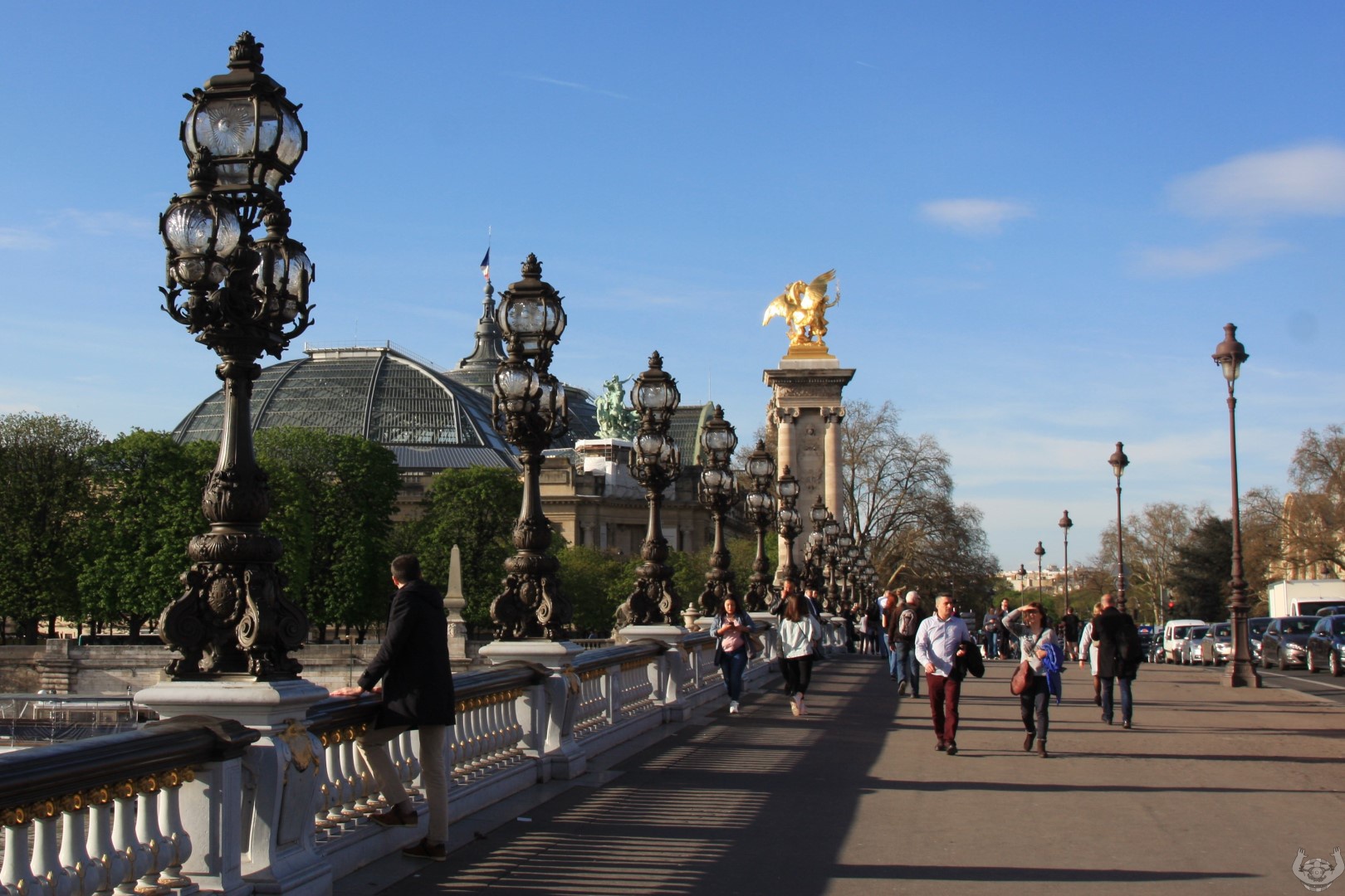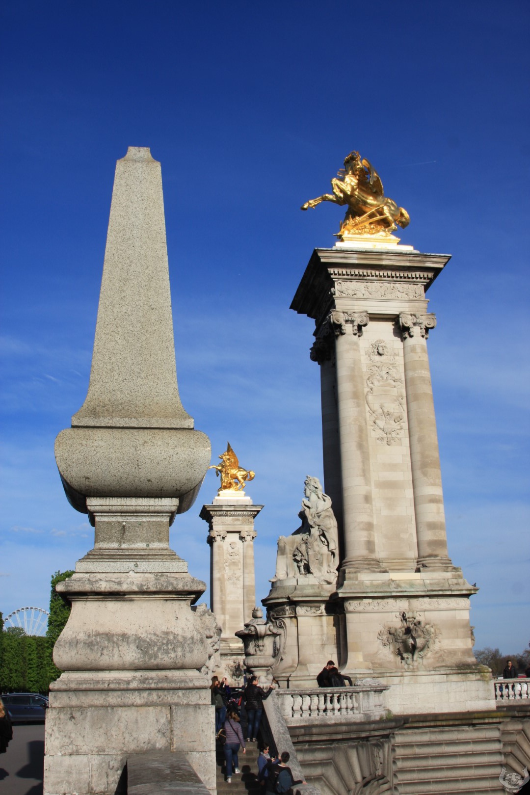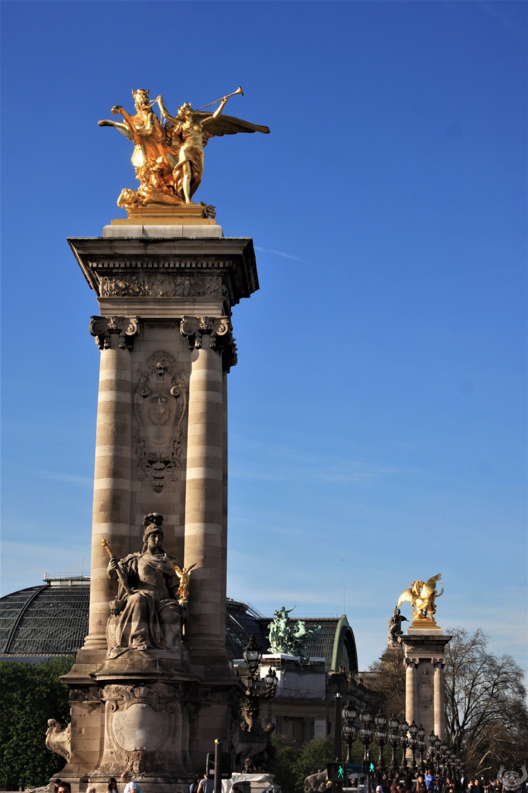 Bij Hotel des Invalides ligt ook een kazerne. Hier zijn we doorgelopen om uit te komen bij een buxustuin met kanonnen en daarna de prachtige brug Pont Alexandre-III over de Seine waar je een mooi uitzicht over een deel van de stad hebt. Er werd net een bruidsreportage gemaakt waarvan ik ook een mooie foto heb genomen. Net effe anders dan bij ons hoor.
