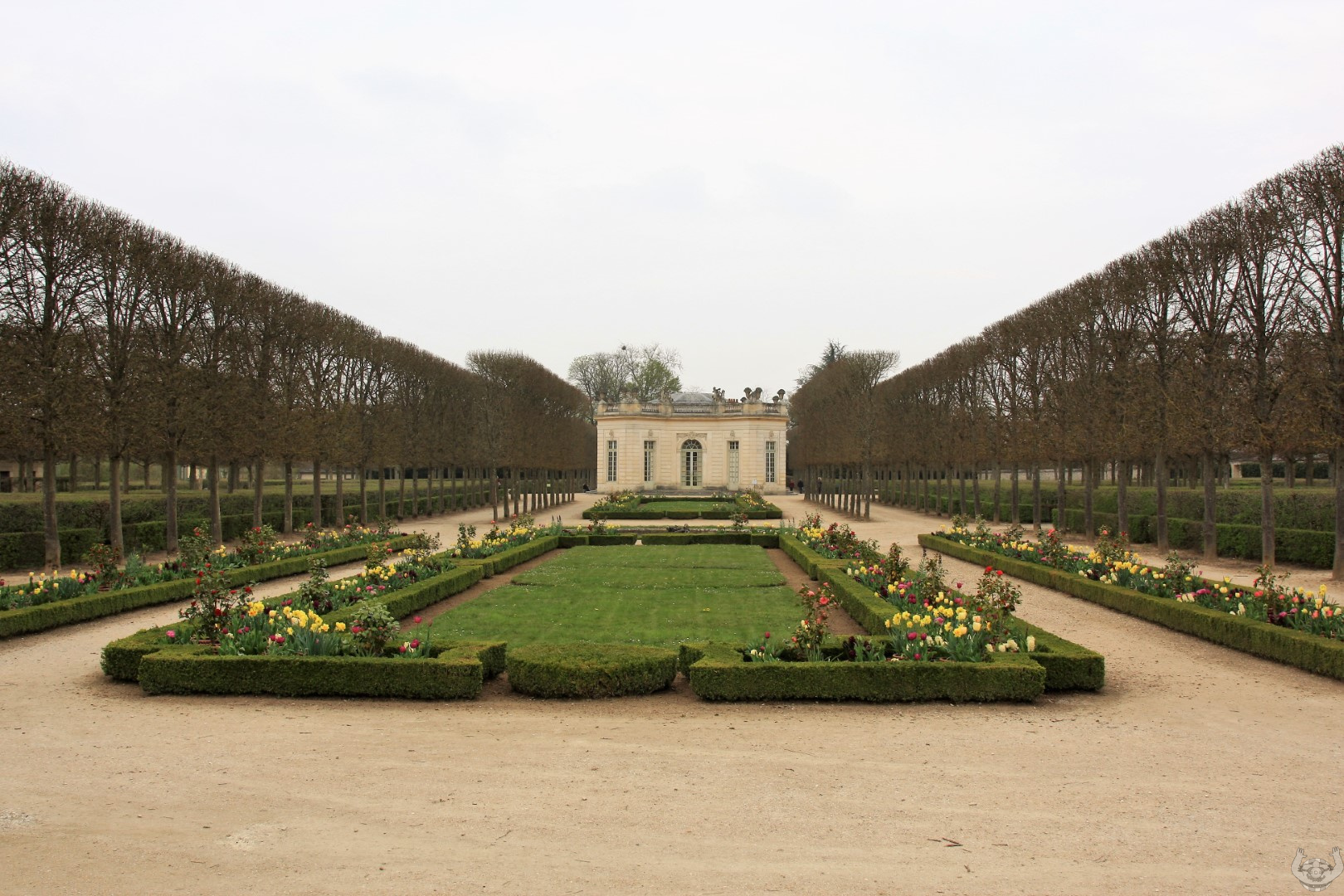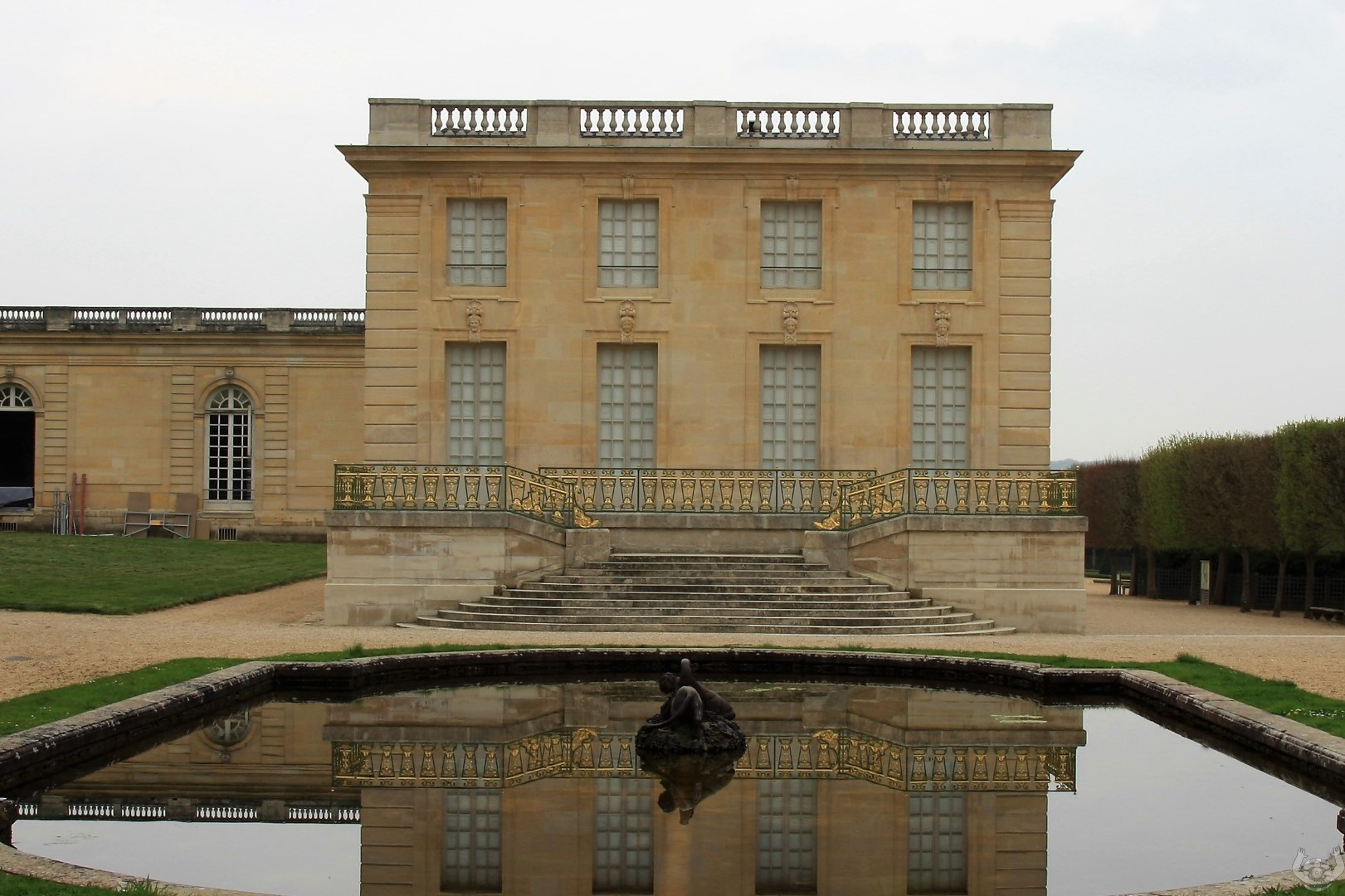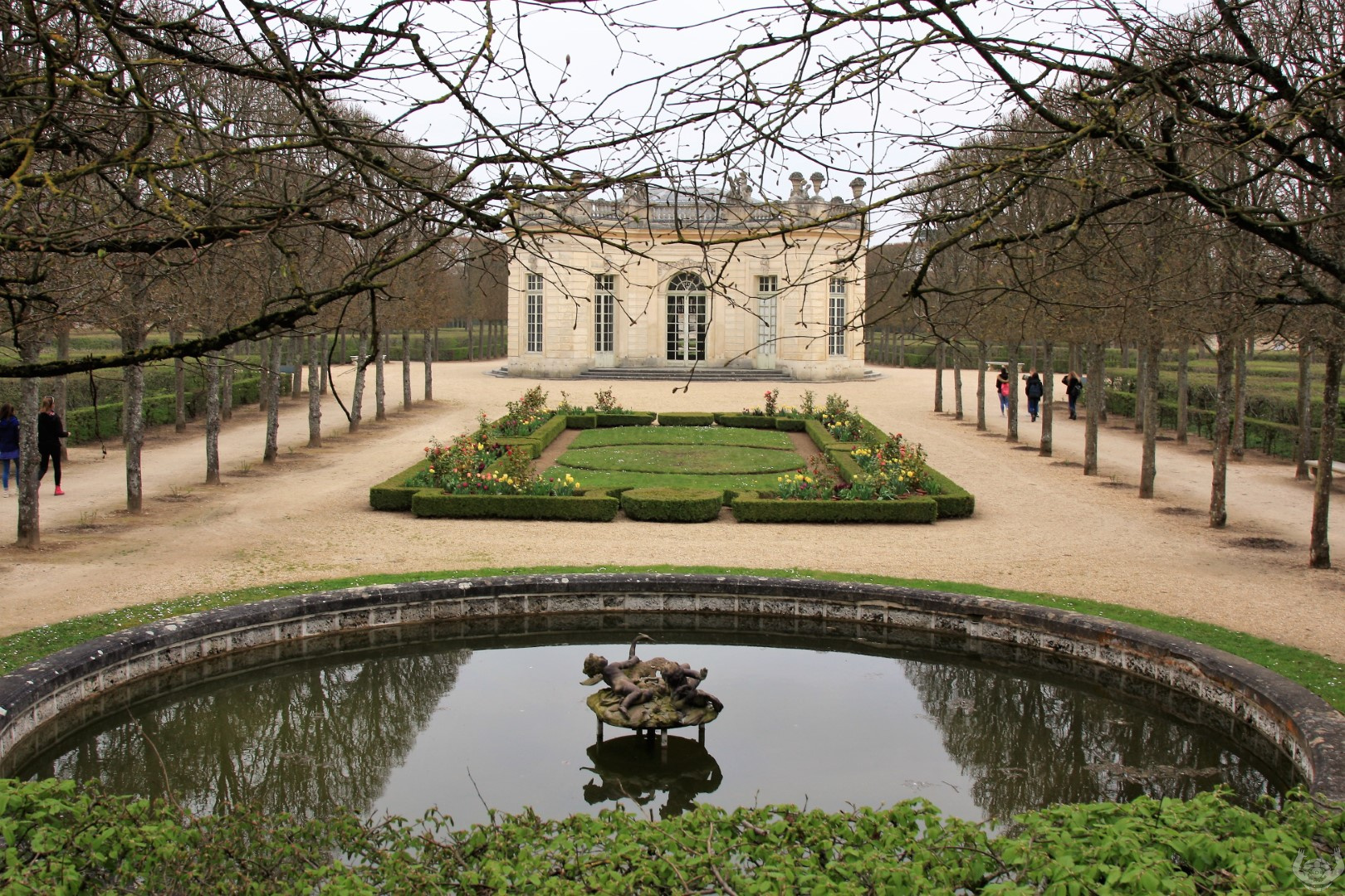 In de tuin van het petit Trianon staat het Domaine de Marie Antoinette een mooie stenen koepel waar wij in Nederland theeconcerten in zouden geven. Heel fraai allemaal. Als je wat verder doorloopt kom je bij een oud molentje en een oud boerderijtje uit 1760. Het lijkt wel een knibbel knabbel knuisje huisje, maar de heks hebben we niet gevonden. Daarna verder door de tuin gelopen waarna we bij nog meer mooie huisjes kwamen en heel veel in bloei staande tulpenbomen en bloesems. Prachtig! Daarna terug naar le petit Trianon om door de Nederlandse bloementuin met Tulpen, Hyacinten en Narcissen door te steken naar le Grand Trianon; een buitenverblijf dat de zonnekoning Louis XIV gebouwd heeft voor zijn minnares…. prachtig met roze marmer ingelegd aan de buitenkant met ook weer een prachtige tuin. Deze tuin heeft maar weinig vijvers en nog minder fonteinen. Die vind je dus allemaal bij het enorme hoofdverblijf.