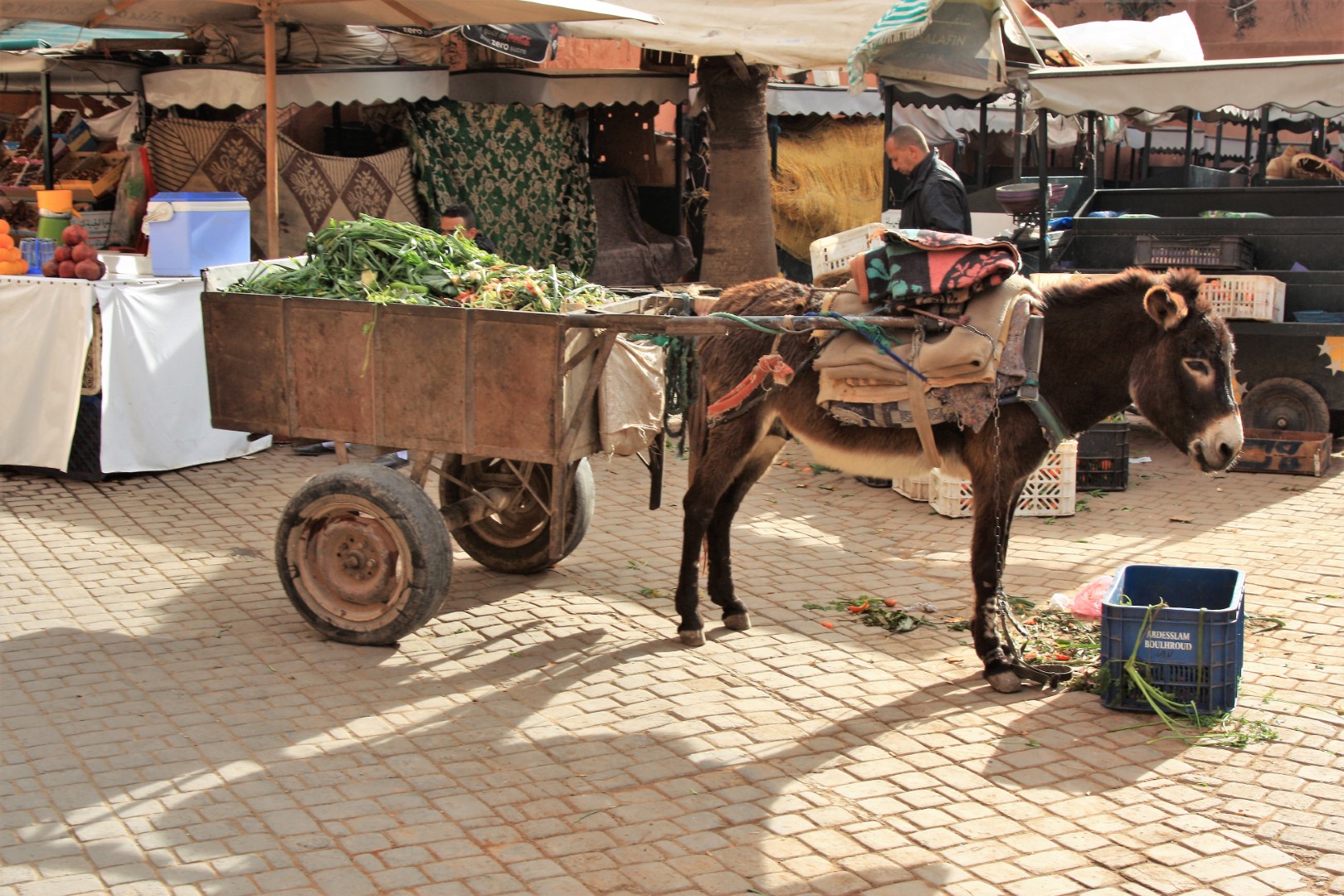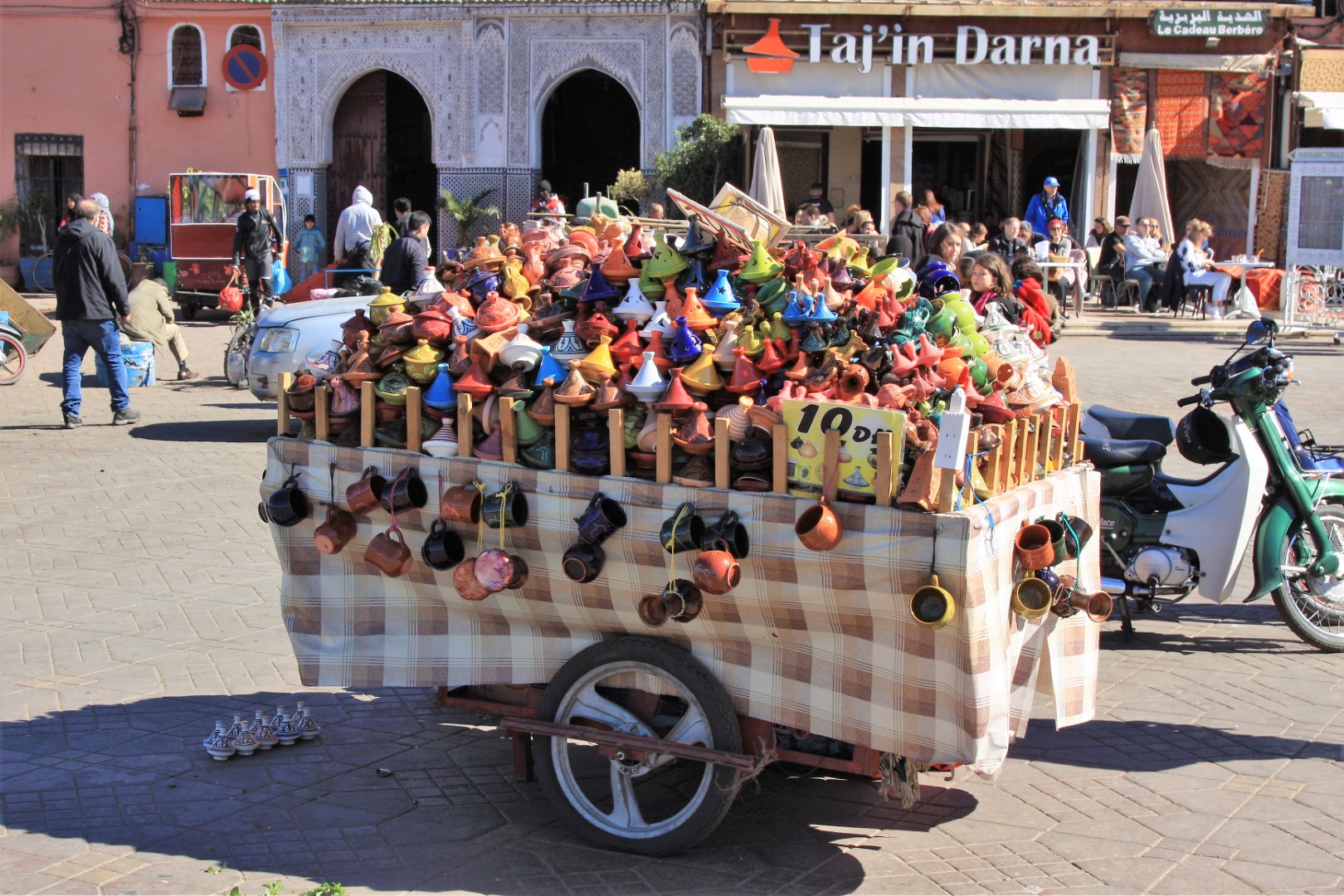 Uitleg gehad en vervolgens de stad in. Lekker koffie bij de Starbucks en daarna naar de soekh. Wat een prachtige kleuren en wat een heerlijk zonnetje. Genieten hoor! Bij de Starbucks komt een man het terras op met een truttentrolly en laat die onbemand staan en loopt naar binnen. Omdat er daar ook een uitgang aan de zijkant is kijk ik hem na wat hij gaat doen. Tegenover mij zit een man en die zegt ik hou hem wel in de gaten hij is koffie aan het halen. Ik verwacht niet dat de koffer explodeert. Twee zielen een gedachte….