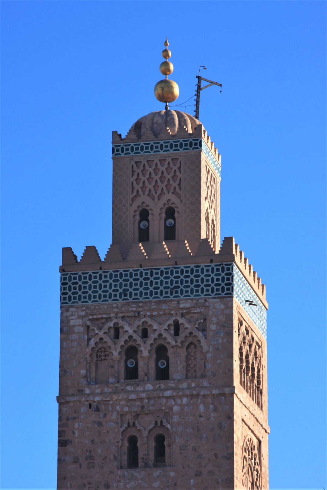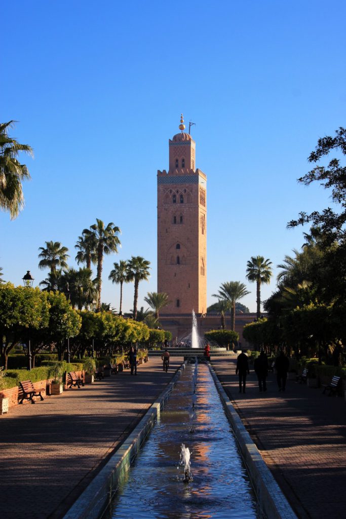 Op tijd op om te genieten van het ontbijtbuffet. 9 uur vertrek met de bus naar de Koutoubia moskee. We hebben vanaf nu een gids genaamd Lhassan. Hij spreekt prima nederlands. Hij vertelt dat de Moskee is gebouwd rond 1168 en ook 68 meter hoog is. Hij heeft 4 goudkleurige bollen op het dak terwijl dat er normaal maar 3 zijn. De 4e kleinste bol is van puur goud. Naast het dak hangt een soort galg waar vroeger als er gebeden werd een witte vlag aan werd gehangen omdat de preken werden gesproken en er nog geen speakers waren. Zo wist iedereen dat het tijd was om te bidden.