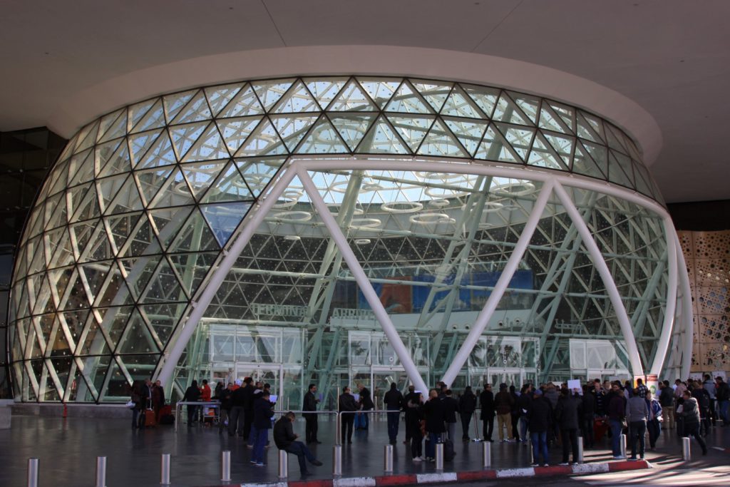 Vanochtend om even na 6en steeg het vliegtuig op om om half 9 plaatselijke tijd op Marrakech aan te komen. Veel gedonder bij de douane lange rijen met sjagrijnige ambtenaren die ons niet wilden doorlaten omdat wij nog niet wisten in welk hotel wij zouden verblijven. Dus naar het politiekantoor die vervolgens maar wat invulde op ons formulier en opnieuw in de rij.