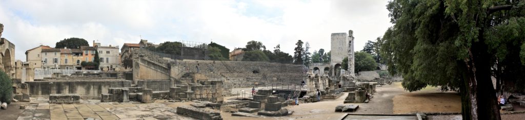 ‘S middags zijn we naar Arles gereden om daar nog even naar wat souvenirs te kijken en nog een bezoek te brengen aan het kleine theater. We willen nog steeds een leuke Flamingo zien te vinden voor op onze souvenirplankjes thuis, maar de meeste zijn veel te groot. Wel vinden we mooie placemats met de schilderijen van van Gogh. ’s avonds willen we graag een pizza eten, dus strijken we neer op een terras met overkapping voor het geval het gaat regenen, want we horen de hele dag al onweer in de buurt en vanochtend heeft het voor het eerst ook flink geregend. We hebben het echter droog gehouden en hebben ook weer lekker met Gerrit door de stad gewandeld ter afscheid. Zaterdag gaan we weer vertrekken en waarschijnlijk gaan we niet meer terug naar Arles.