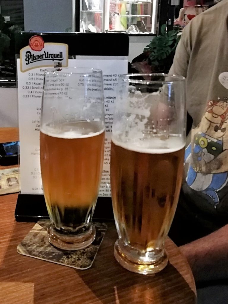 Daarna naar de kabelbaan en de “Eiffeltoren “van Praag de Petřín-uitkijktoren . In de “U Knoflíčků” om de hoek (wat niets met knoflook te maken heeft overigens) hebben we eerst een heerlijk kopje koffie met aardbeiengebak genomen. De kabelbaan was gratis omdat deze onder het openbaar vervoer valt en wij een dagkaart hebben voor het OV. Prachtig uitzicht over de stad en boven aangekomen bleek er ook een prachtige rozentuin te zijn en een observatorium. Ook maar weer naar beneden met de kabelbaan en van daaruit zijn we gaan lopen naar de plaatselijke brouwerij Staropramen.