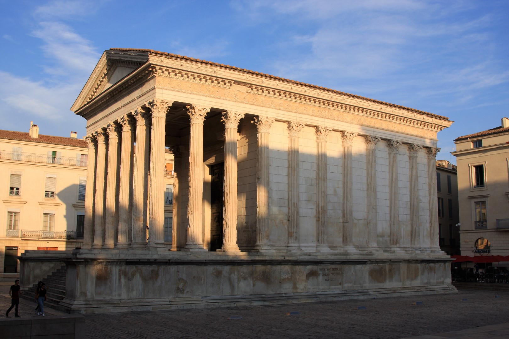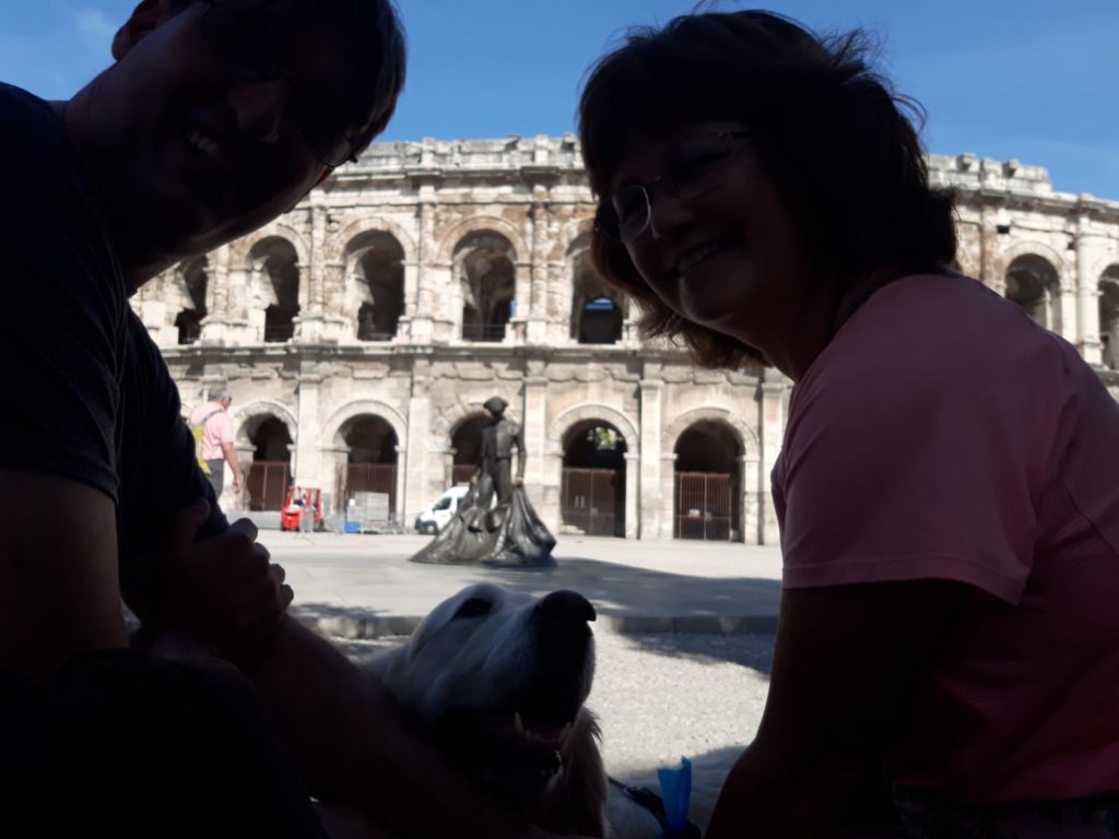 dan ook beloond met een wandeling door een prachtige stad, die ook wat historische zaken laat zien. We hebben vlakbij het vierkante huis “La maison Carrée” geparkeerd dus die bekijken we als eerste. Daarna lopen we door naar de Arena. Deze is de minst mooie die we tot nu toe gezien hebben, maar nog steeds leuk om geweest te zijn. Er staat een beeld van een toreador op het plein en omdat iedereen daar een selfie neemt, doen wij dat samen met Ger ook maar.