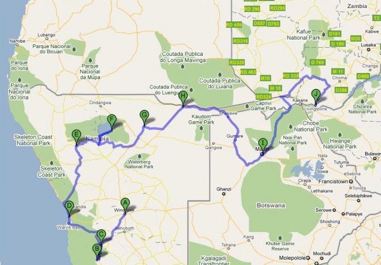 Hieronder ons reisschema voor de vakantie in Namibie, Botswana en Zambia.